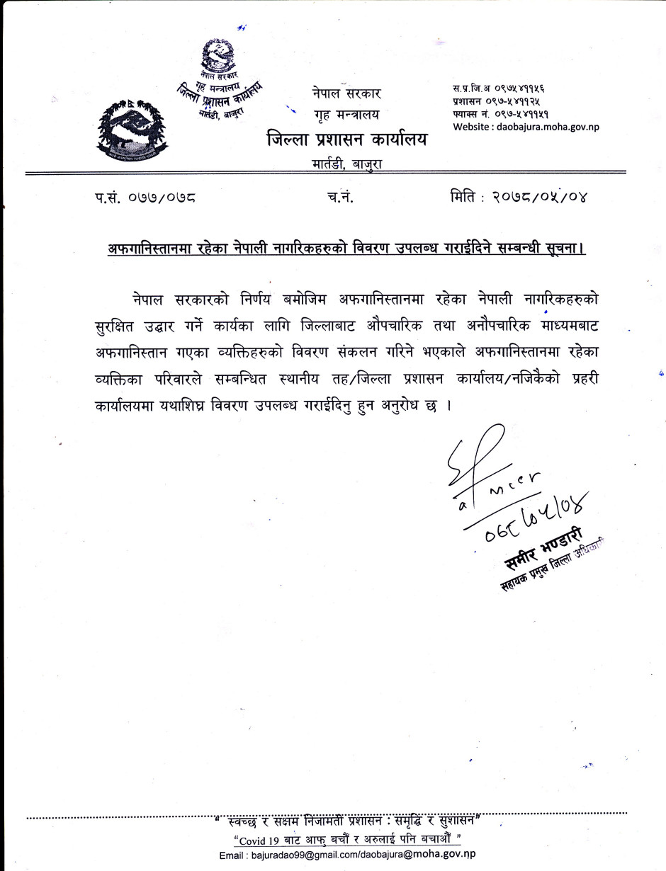 अफगानिस्तानमा रहेका नेपाली नागरिकहरुको विवरण उपलब्ध गराईदिने सम्बन्धी सूचना।