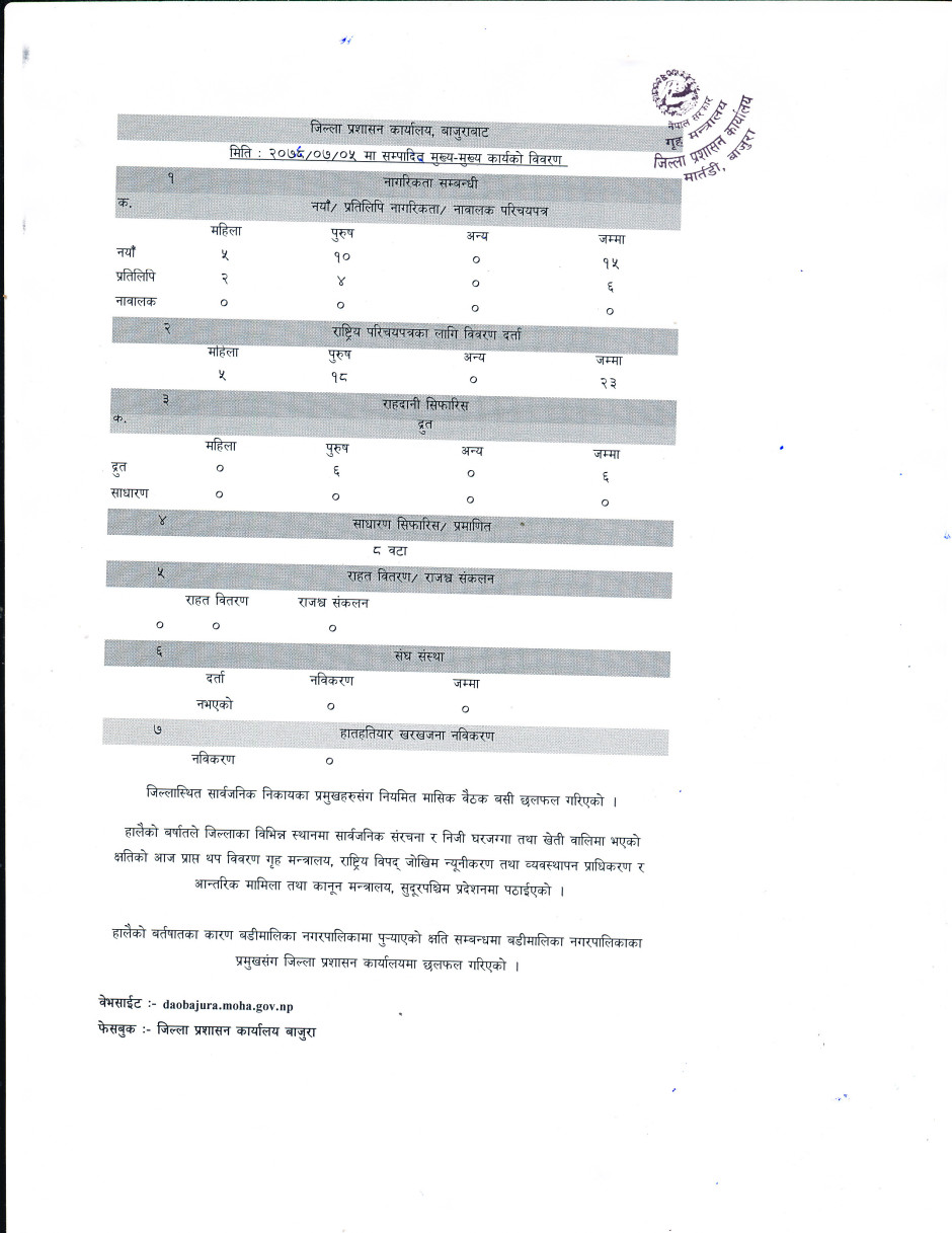 जिल्ला प्रशासन कार्यालय बाजुराबाट मिति २०७८/०७/०५ गते सम्पादित मुख्य-मुख्य कार्यहरु ।