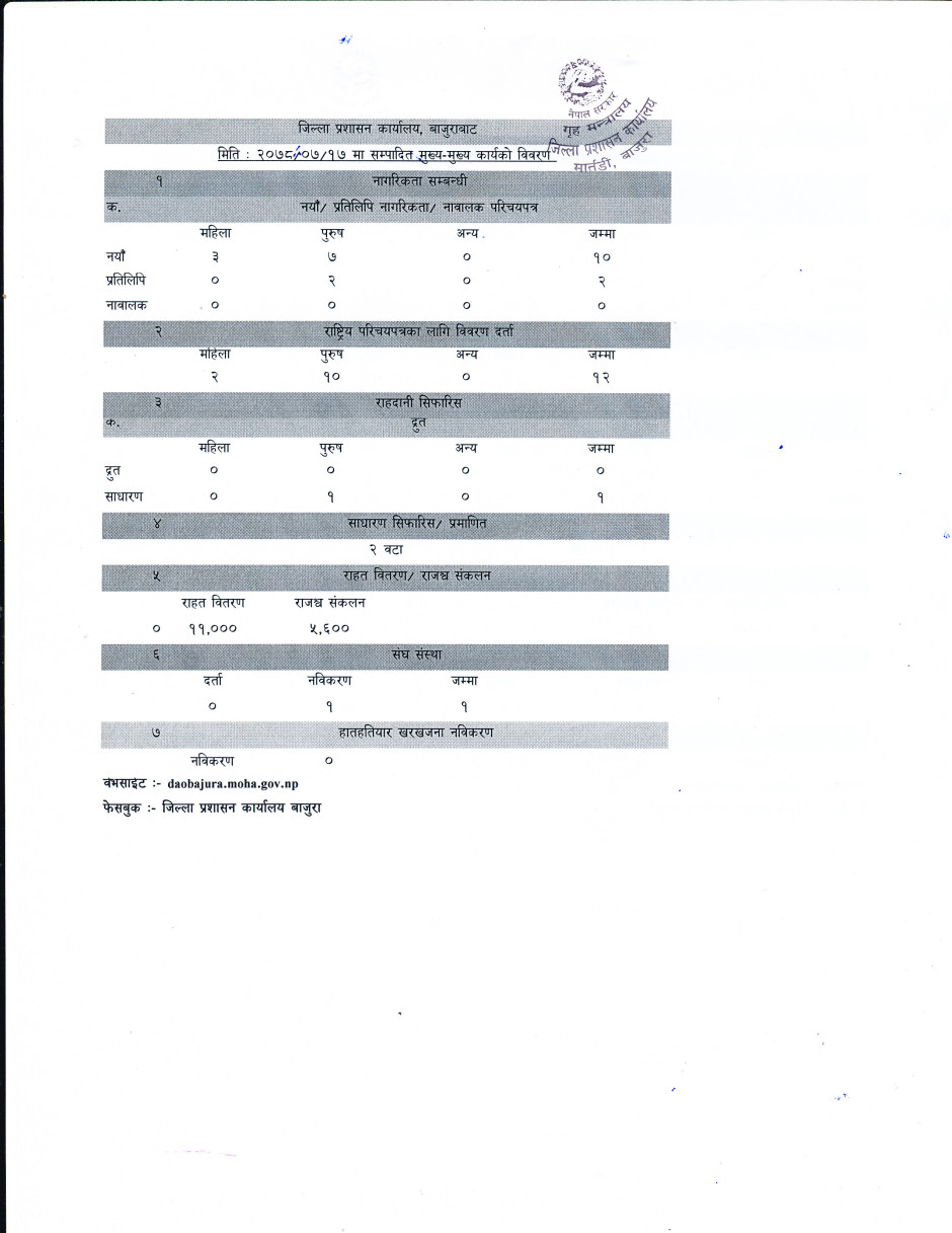 जिल्ला प्रशासन कार्यालय बाजुराबाट मिति २०७८/०७/१७ गते सम्पादित मुख्य-मुख्य कार्यहरु ।