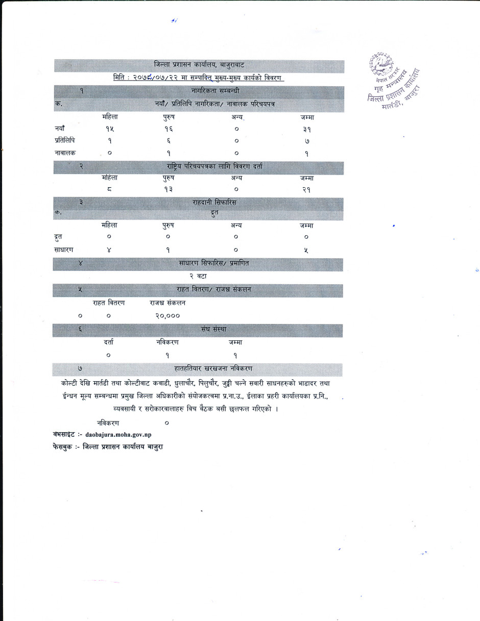 जिल्ला प्रशासन कार्यालय बाजुराबाट मिति २०७८/०७/२२ गते सम्पादित मुख्य-मुख्य कार्यहरु ।