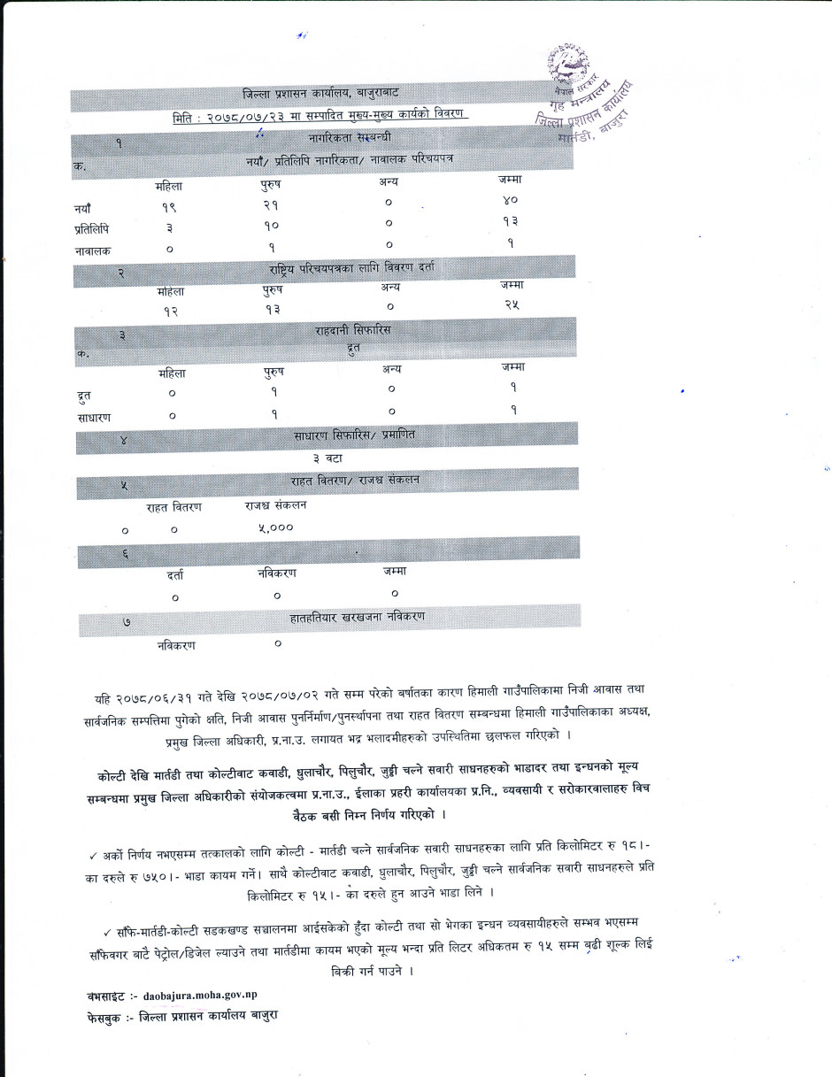 जिल्ला प्रशासन कार्यालय बाजुराबाट मिति २०७८/०७/२३ गते सम्पादित मुख्य-मुख्य कार्यहरु ।