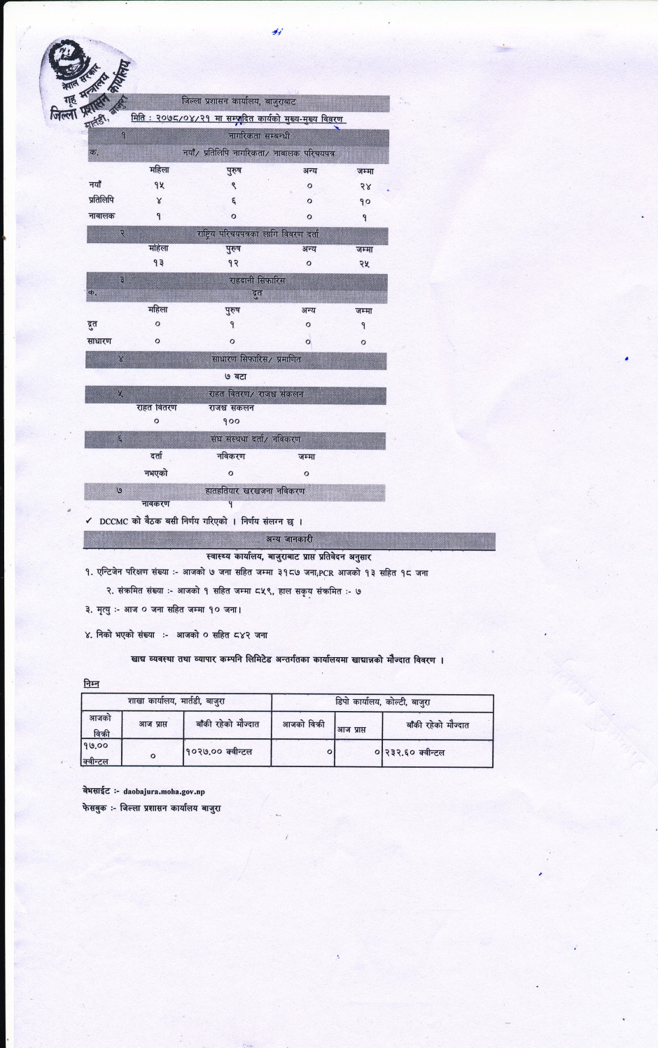 जिल्ला प्रशासन कार्यालय बाजुरावाट मिति २०७८/०४/२१ गते सम्पादित मुख्य -मुख्य कार्यहरु ।