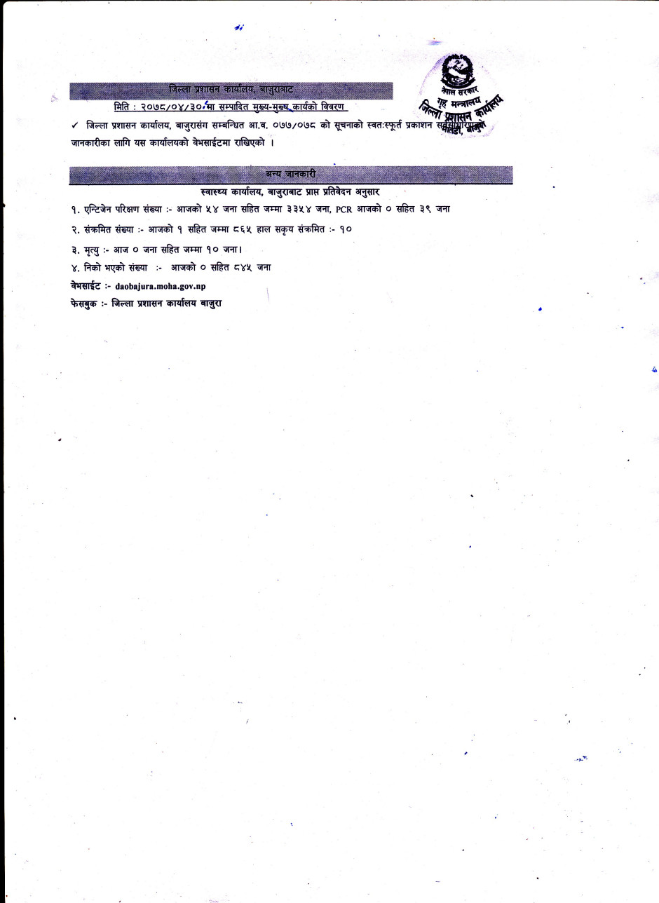जिल्ला प्रशासन कार्यालय बाजुरावाट मिति २०७८/०४/३० गते सम्पादित मुख्य -मुख्य कार्यहरु ।