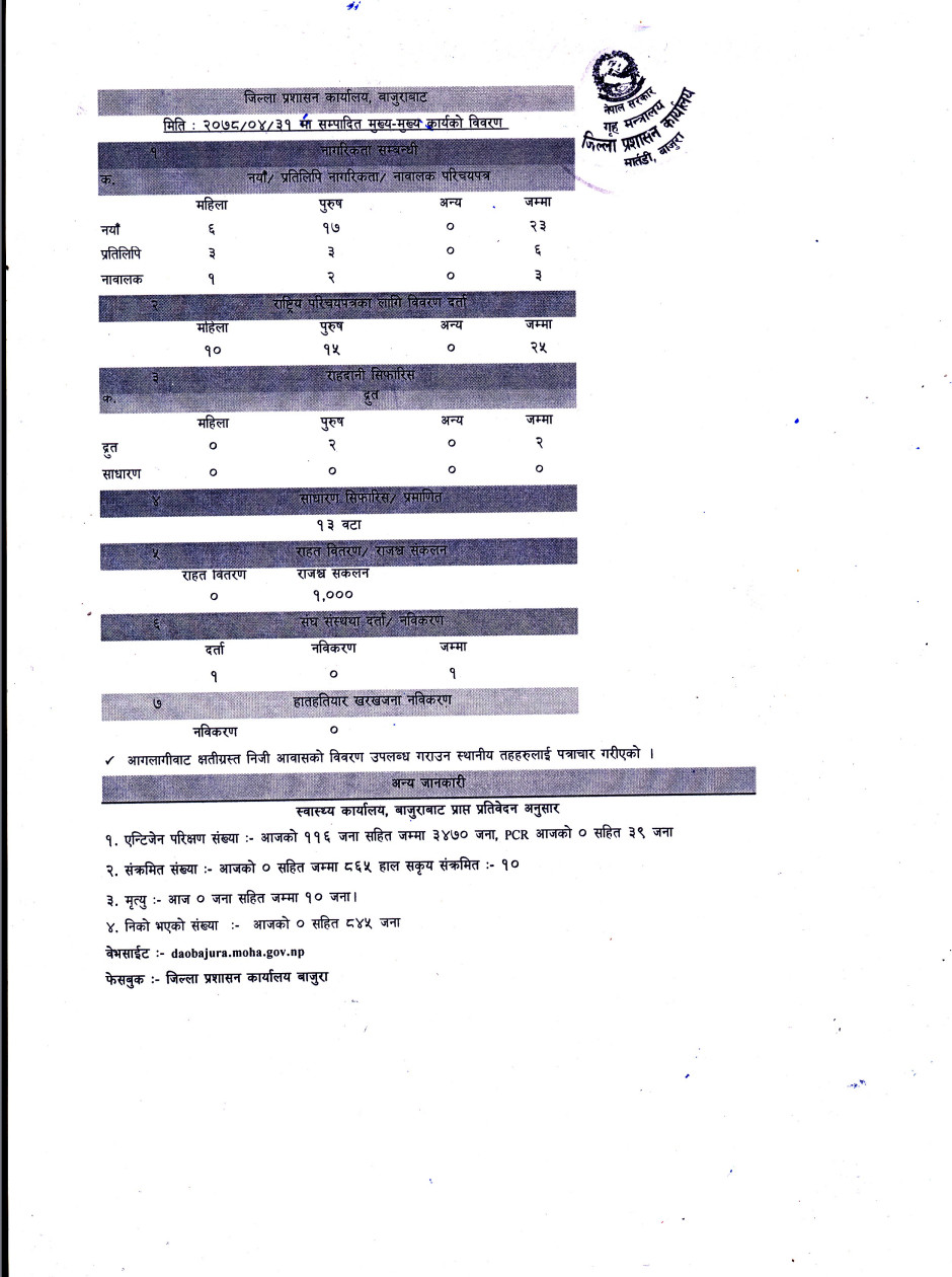 जिल्ला प्रशासन कार्यालय बाजुरावाट मिति २०७८/०४/३१ गते सम्पादित मुख्य -मुख्य कार्यहरु ।