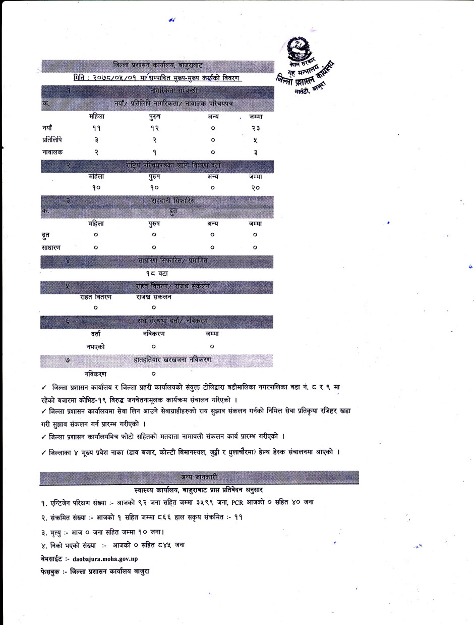 जिल्ला प्रशासन कार्यालय बाजुरावाट मिति २०७८/०५/०१ गते सम्पादित मुख्य -मुख्य कार्यहरु ।
