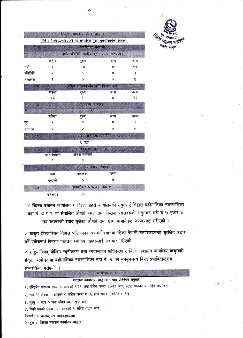 जिल्ला प्रशासन कार्यालय बाजुरावाट मिति २०७८/०५/०३ गते सम्पादित मुख्य -मुख्य कार्यहरु ।