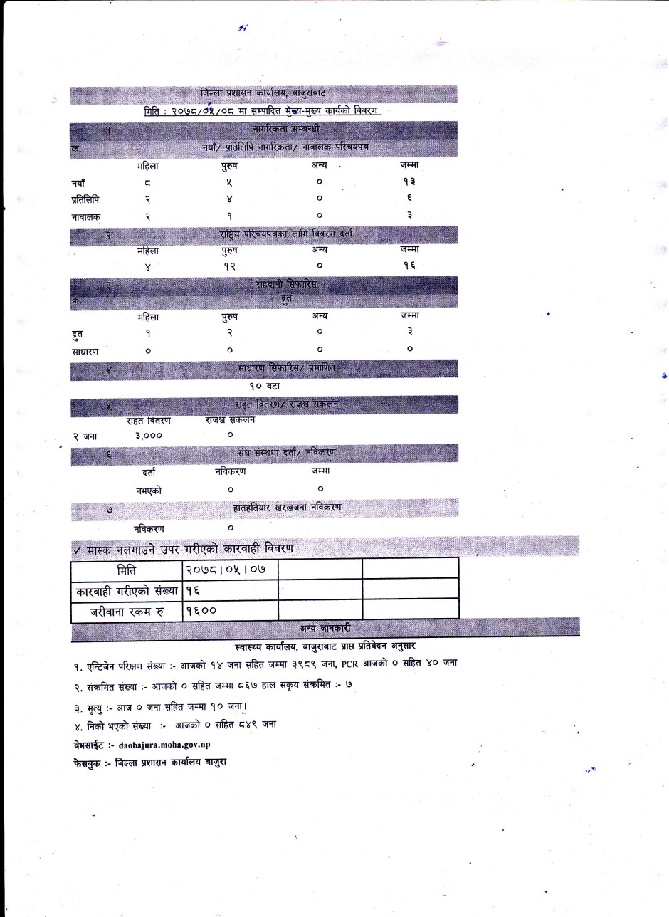 जिल्ला प्रशासन कार्यालय बाजुरावाट मिति २०७८/०५/०८ गते सम्पादित मुख्य -मुख्य कार्यहरु ।