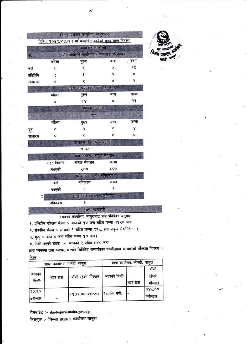 जिल्ला प्रशासन कार्यालय बाजुरावाट मिति २०७८/०४/१३ गते सम्पादित मुख्य -मुख्य कार्यहरु ।