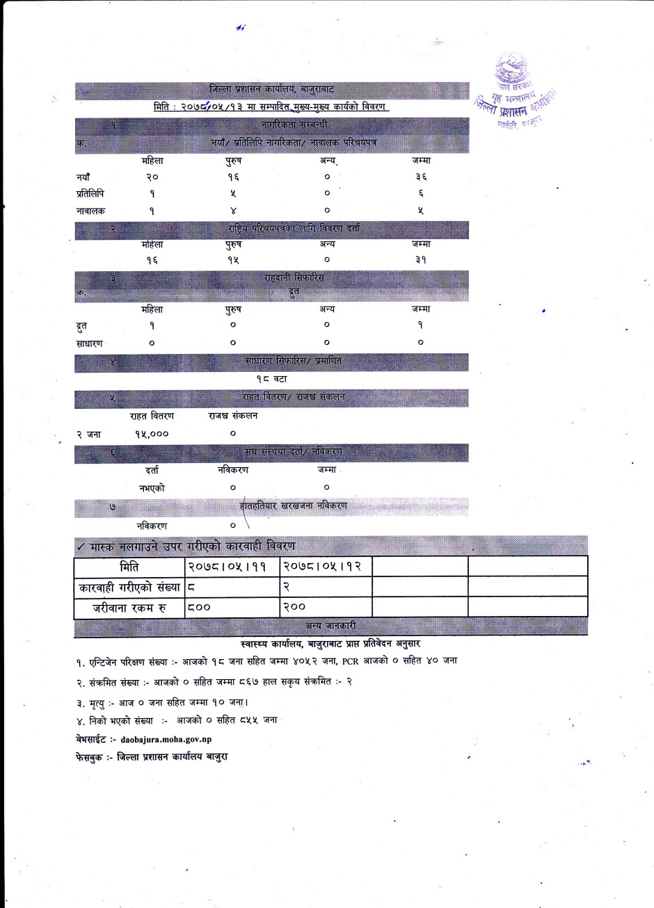 जिल्ला प्रशासन कार्यालय बाजुरावाट मिति २०७८/०५/१३ गते सम्पादित मुख्य -मुख्य कार्यहरु ।