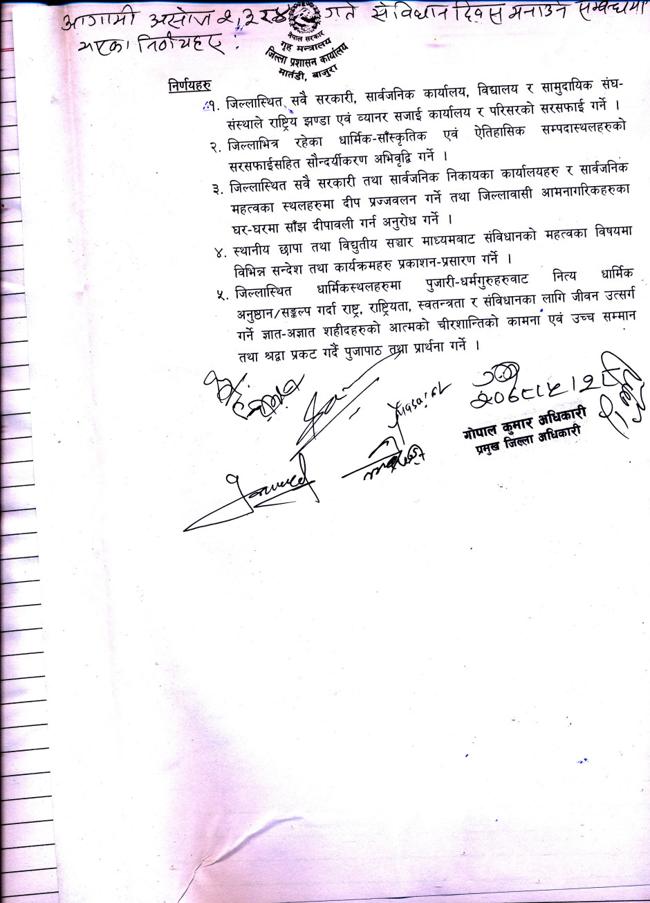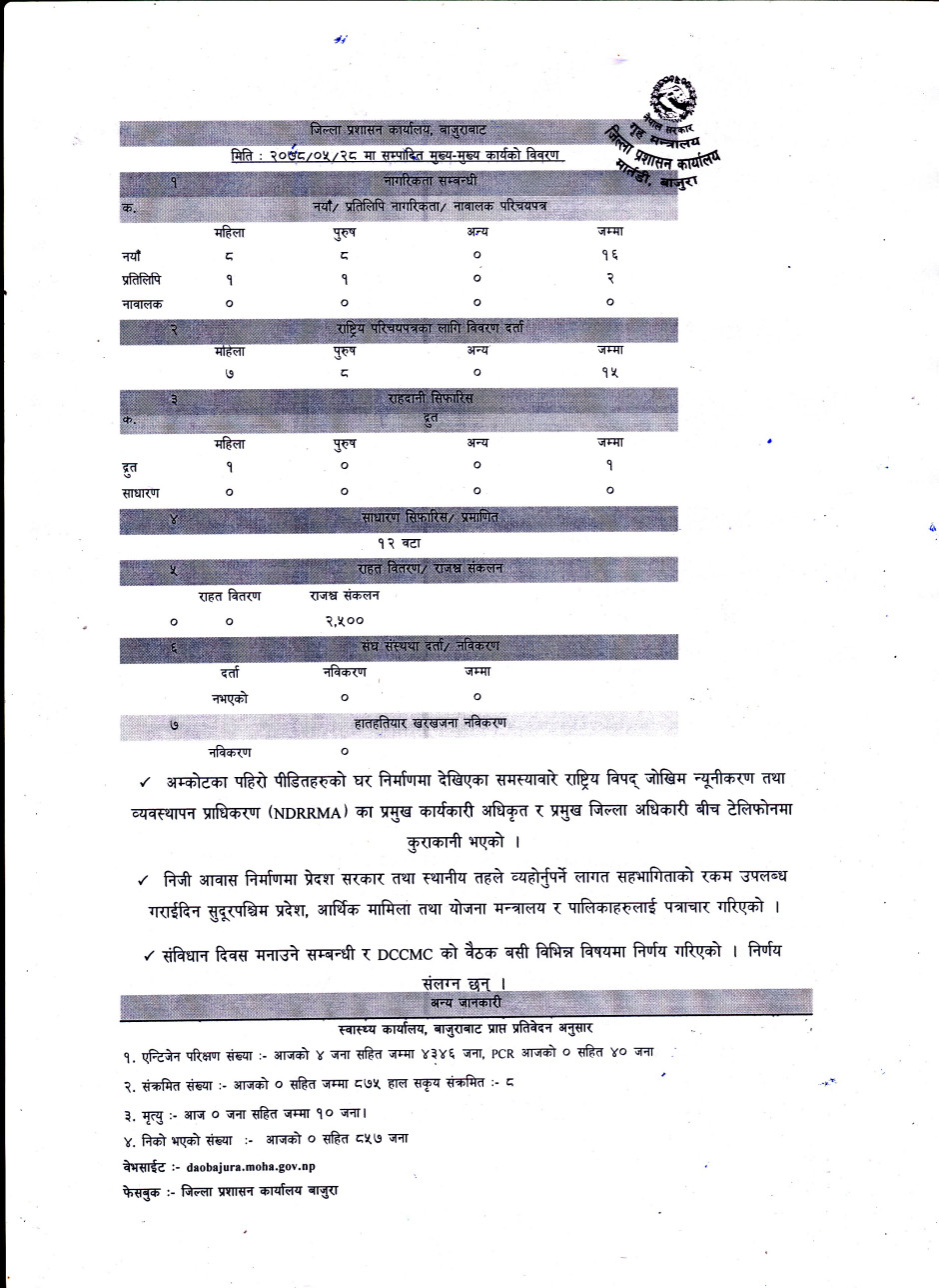 जिल्ला प्रशासन कार्यालय बाजुरावाट मिति २०७८/०५/२८ गते सम्पादित मुख्य -मुख्य कार्यहरु ।