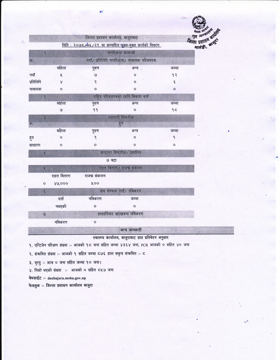 जिल्ला प्रशासन कार्यालय बाजुरावाट मिति २०७८/०५/२९ गते सम्पादित मुख्य -मुख्य कार्यहरु ।