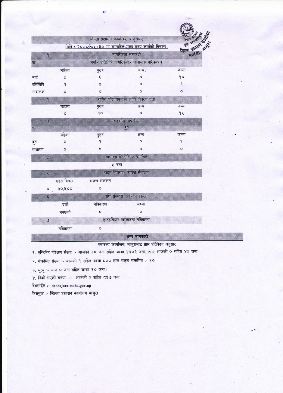 जिल्ला प्रशासन कार्यालय बाजुरावाट मिति २०७८/०५/३० गते सम्पादित मुख्य -मुख्य कार्यहरु ।