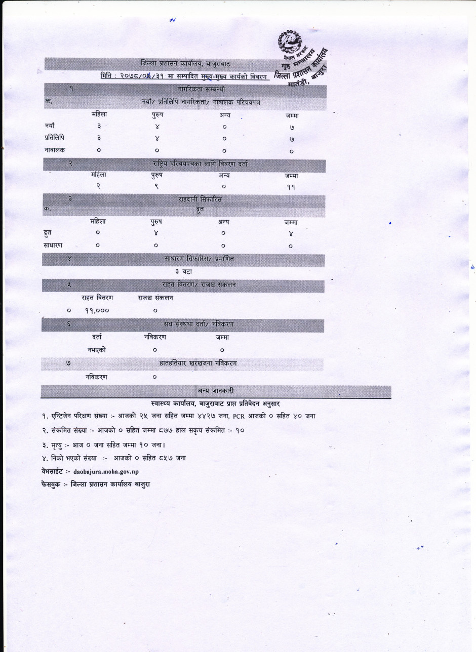 जिल्ला प्रशासन कार्यालय बाजुरावाट मिति २०७८/०५/३१ गते सम्पादित मुख्य -मुख्य कार्यहरु ।