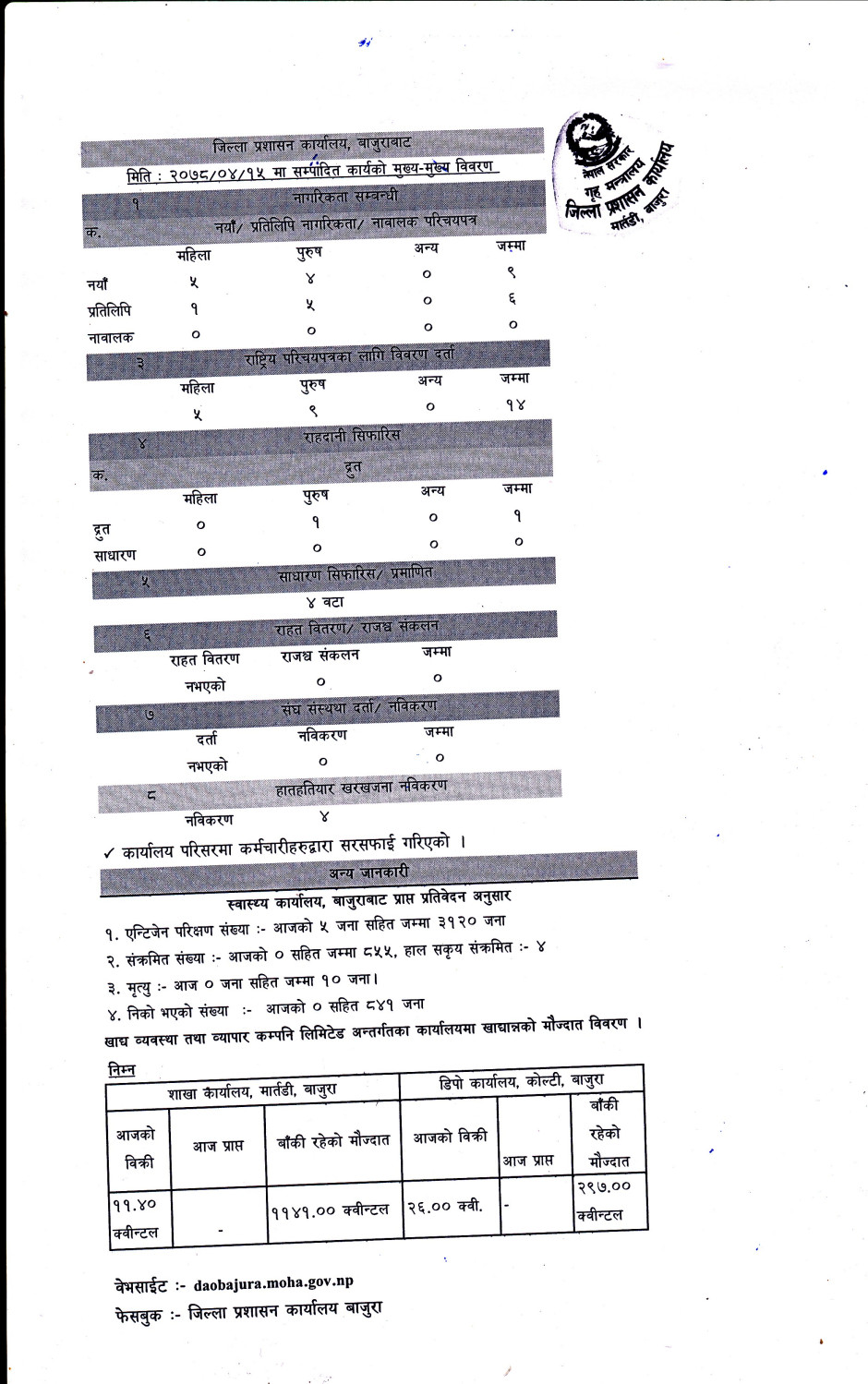 जिल्ला प्रशासन कार्यालय बाजुरावाट मिति २०७८/०४/१५ गते सम्पादित मुख्य -मुख्य कार्यहरु ।