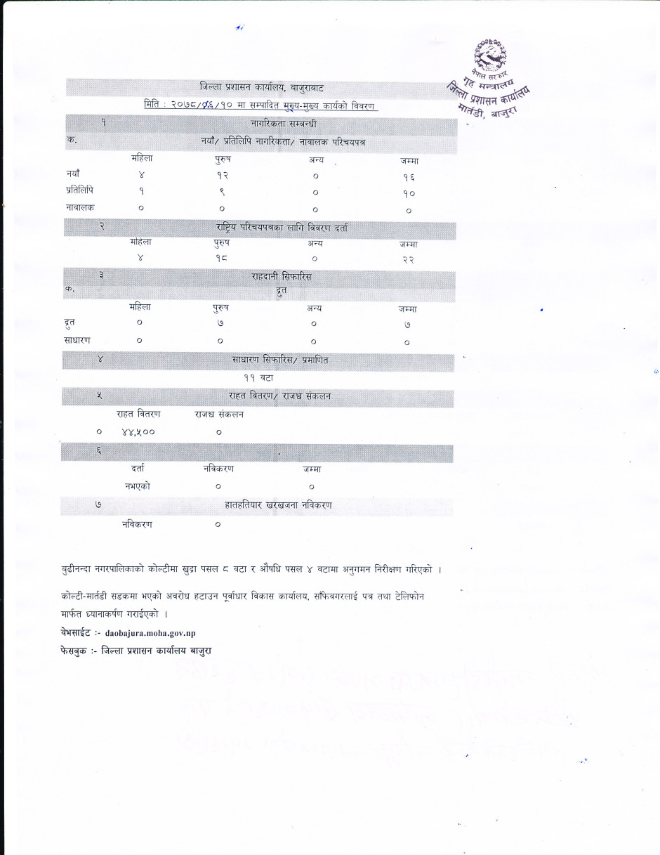 जिल्ला प्रशासन कार्यालय बाजुरावाट मिति २०७८/०६/१० गते सम्पादित मुख्य -मुख्य कार्यहरु ।