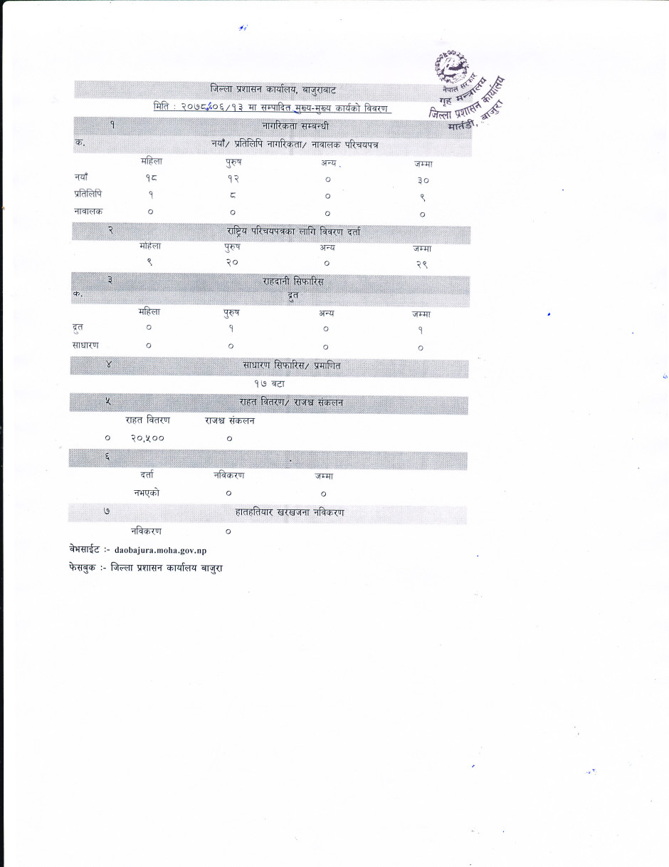 जिल्ला प्रशासन कार्यालय बाजुरावाट मिति २०७८/०६/१३ गते सम्पादित मुख्य -मुख्य कार्यहरु ।