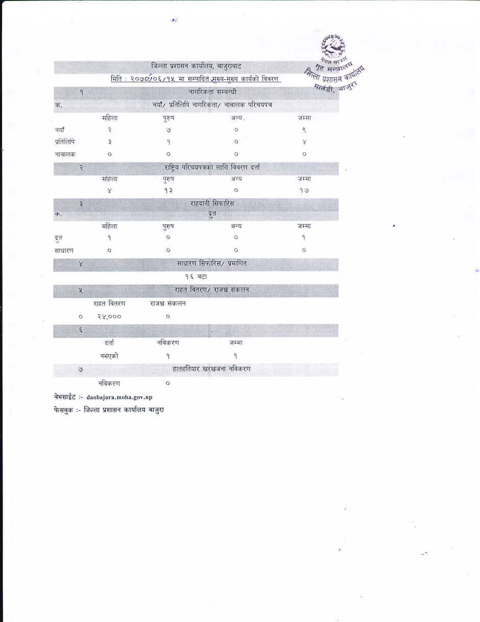 जिल्ला प्रशासन कार्यालय बाजुरावाट मिति २०७८/०६/१५ गते सम्पादित मुख्य -मुख्य कार्यहरु ।