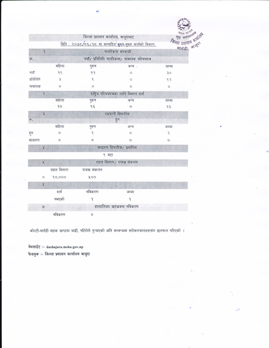 जिल्ला प्रशासन कार्यालय बाजुरावाट मिति २०७८/०६/१८ गते सम्पादित मुख्य -मुख्य कार्यहरु ।