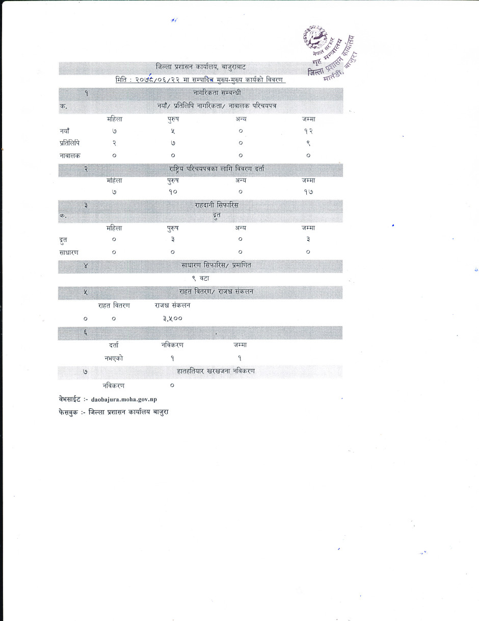 जिल्ला प्रशासन कार्यालय बाजुरावाट मिति २०७८/०६/२२ गते सम्पादित मुख्य -मुख्य कार्यहरु ।