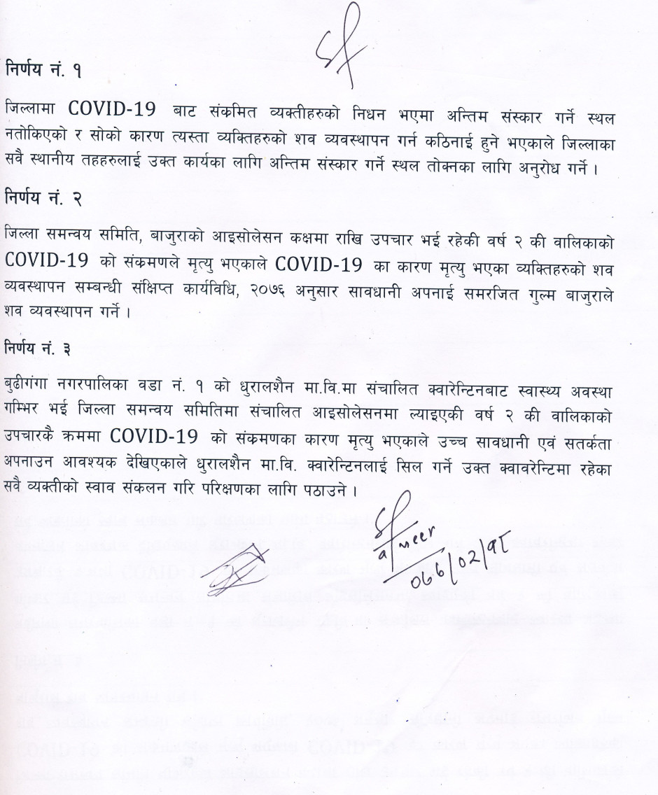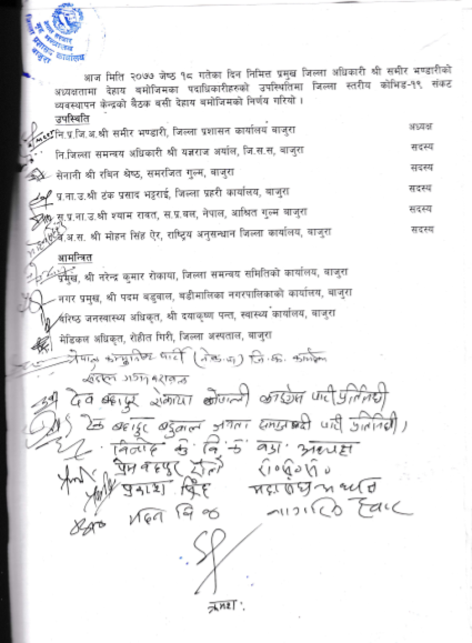 जिल्ला स्तरीय कोभिड १९ संकट व्यवस्थापन केन्द्र बाजुराको ०७७/०२/१८ गतेको निर्णयहरु