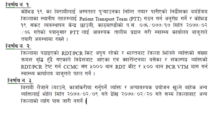 जिल्ला स्तरीय कोभिड १९ संकट व्यवस्थापन केन्द्र बाजुराको मिति २०७७/०२/०८ गते बसेको बैठकको निर्णयहरु