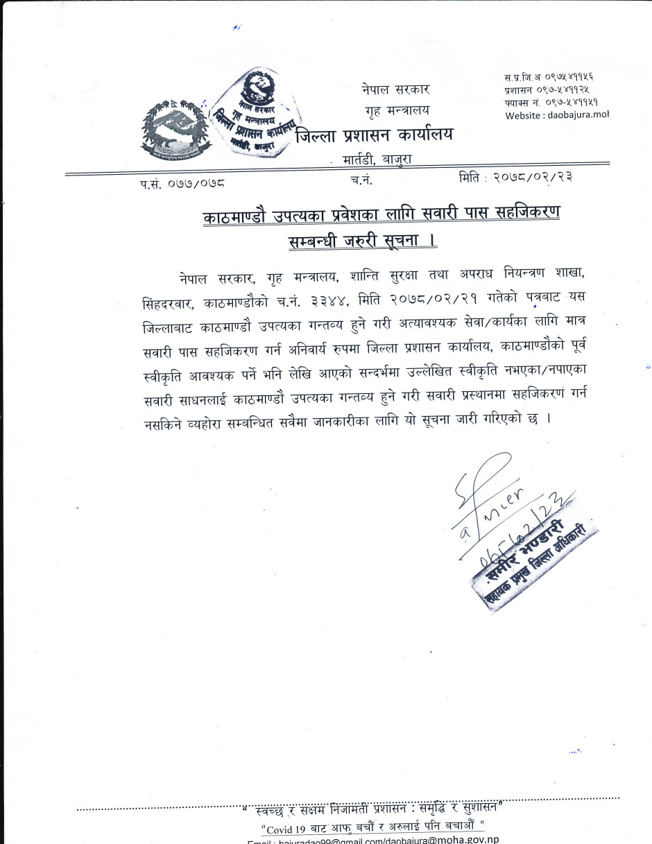 काठमाण्डौ उपत्यका प्रवेशका लागि सवारी पास सहजिकरण सम्बन्धी जरुरी सूचना । मिति २०७८/०२/२३