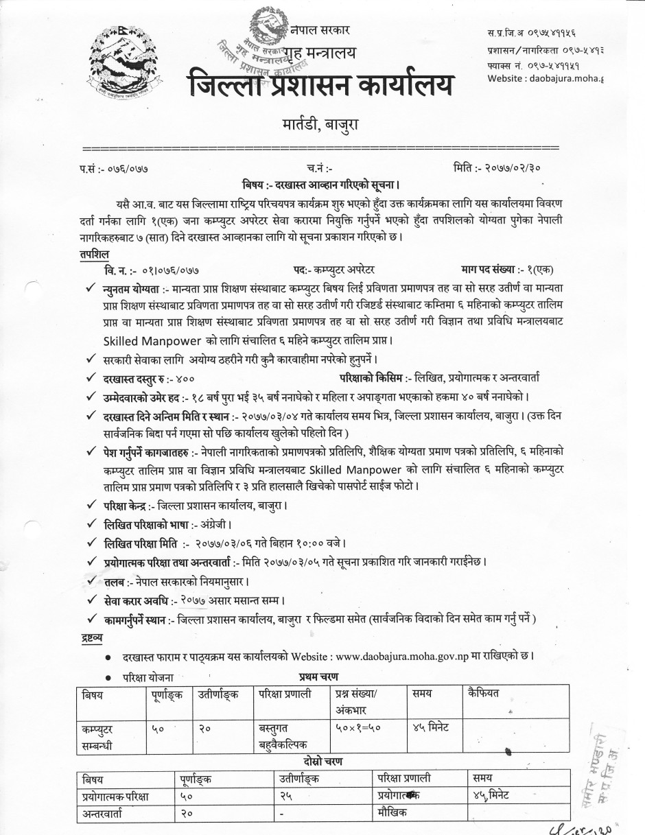 कम्प्युटर अपरेटर पदमा दरखास्त पेश गर्ने सम्बन्धी सूचना ।