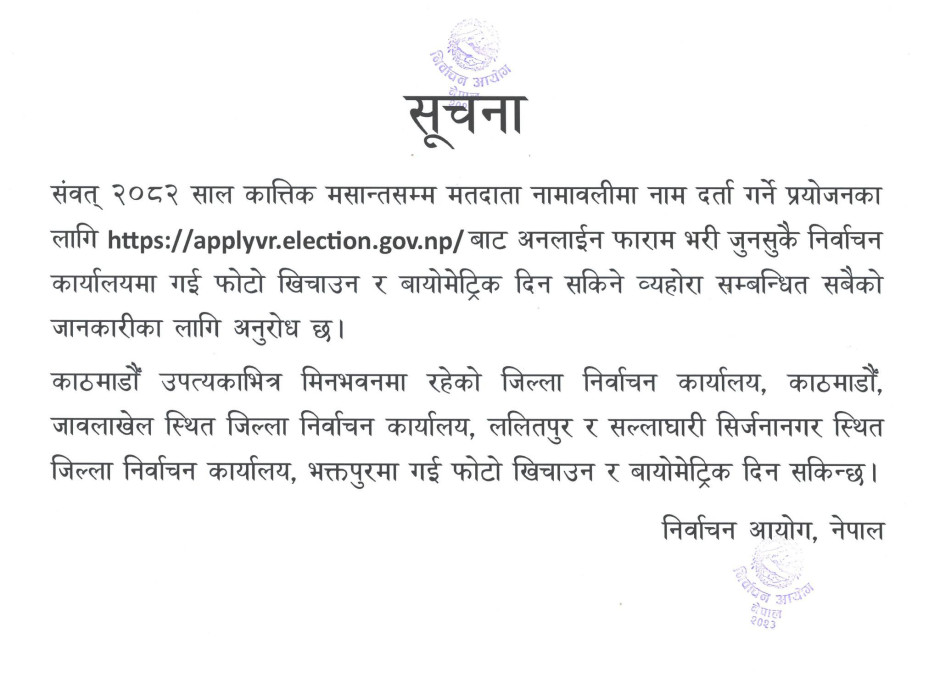 मतदाता नामावलीमा नाम दर्ता गराउने सम्बन्धी निर्वाचन आयोगको सुचना
