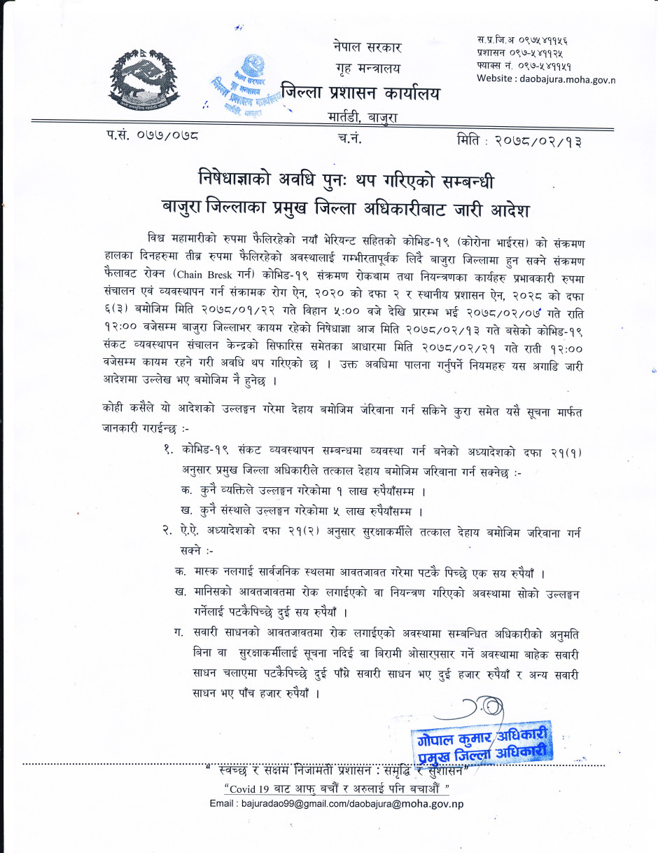 निषेधाज्ञाको अवधि पुन: थप गरिएको सम्बन्धी बाजुरा जिल्लाका प्रमुख जिल्ला अधिकारीबाट जारी आदेश ।