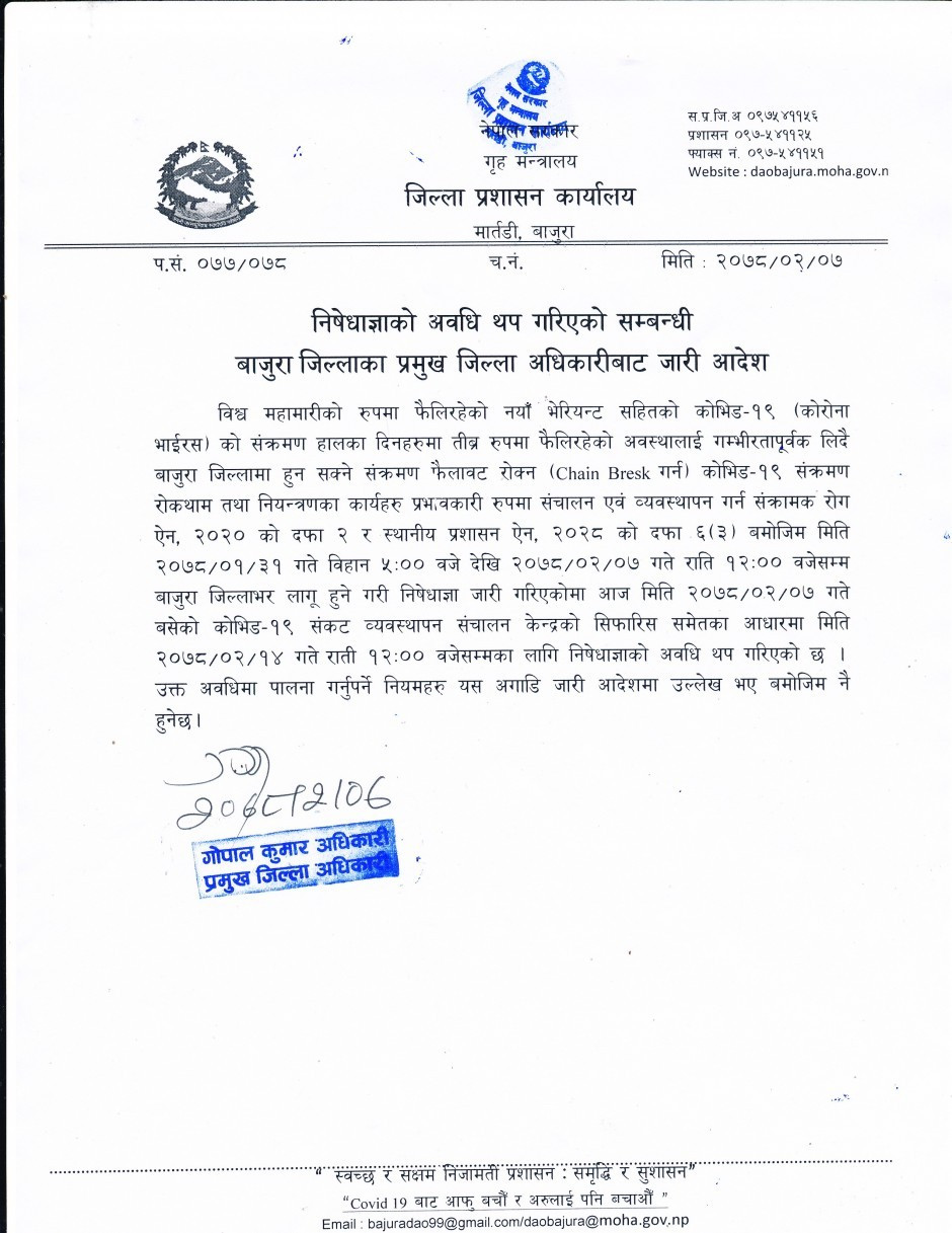 निषेधाज्ञाको अवधि थप गरिएको सम्बन्धी बाजुरा जिल्लाका प्रमुख जिल्ला अधिकारीबाट जारी आदेश ।