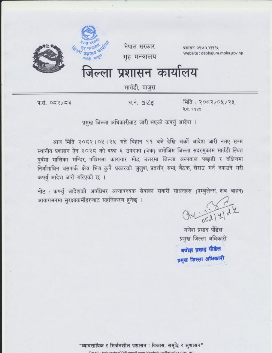 प्रमुख जिल्ला अधिकारीबाट जारी भएको कर्फ्यु आदेश ।