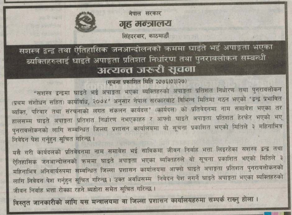 तस्बिर : सशस्त्र द्धन्दमा घाइते भई अपाङ्गता भएका व्यक्तिहरुको अपाङ्गता प्रतिशत निर्धारणका लागि निवेदन पेश गर्ने सम्वन्धी सूचना ।